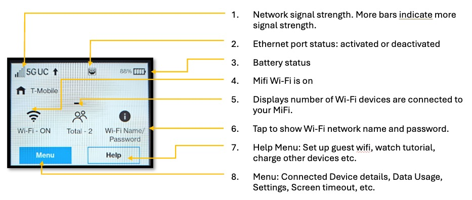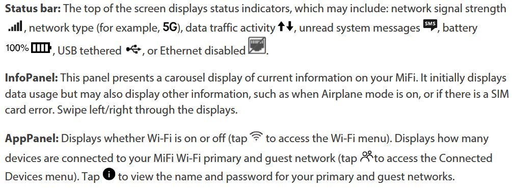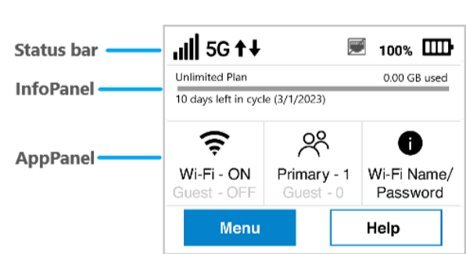 • The touchscreen displays and allows you to viewWi-Fi name and password, connected devices, data usage, and more.